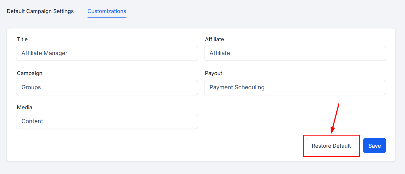 To revert the labels to their default settings, click the Restore Default button in the Customizations section.