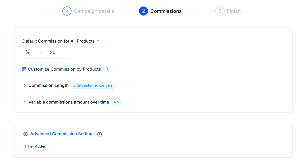 In Step 2 of the campaign setup, define the default commission rate affiliates will earn by default.