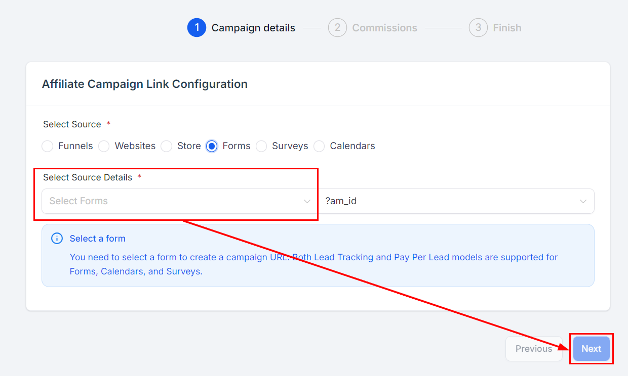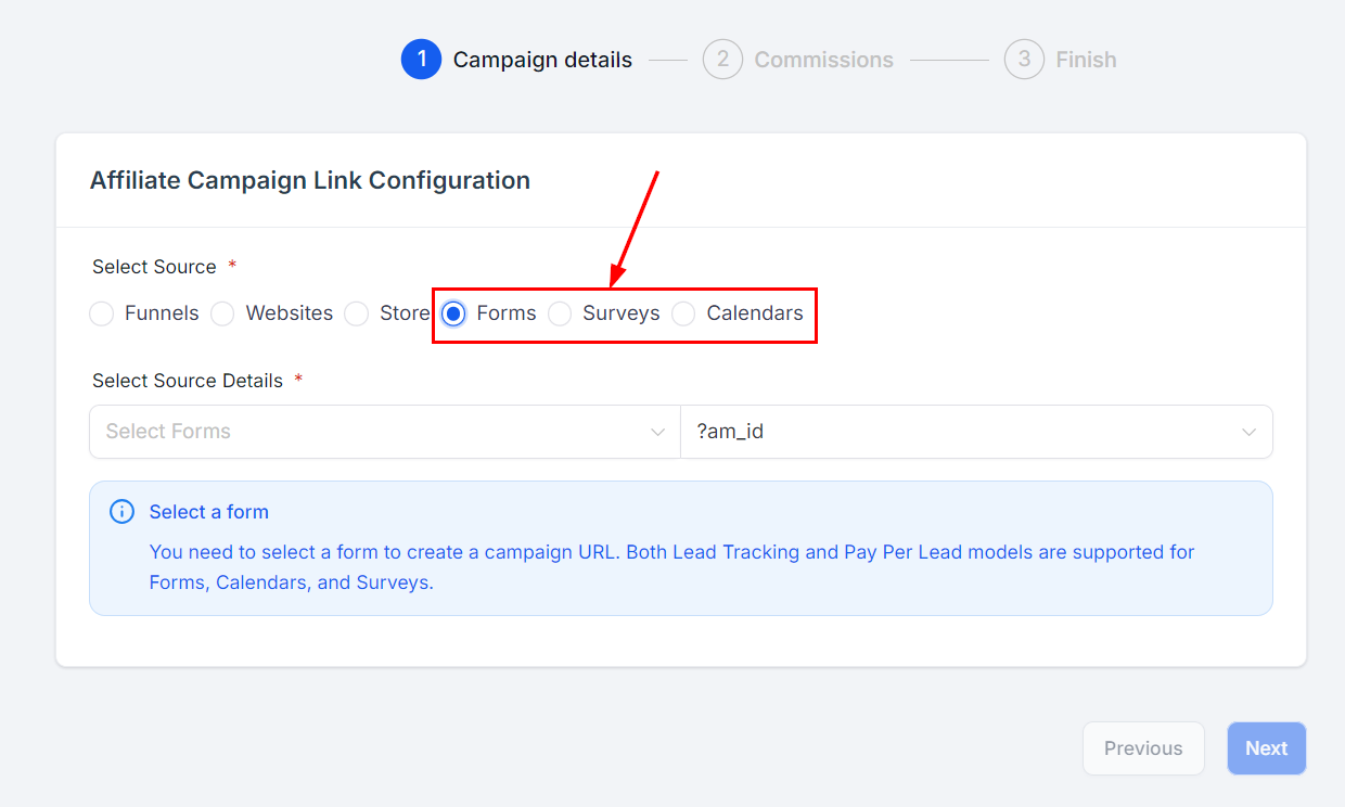 One of the most important aspects of having affiliates is tracking the leads they bring in for you. In cases where the leads they generate may not convert into sales, you can utilize Forms, Surveys, or Calendars as alternative sources to track these leads.