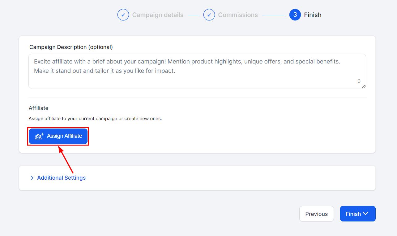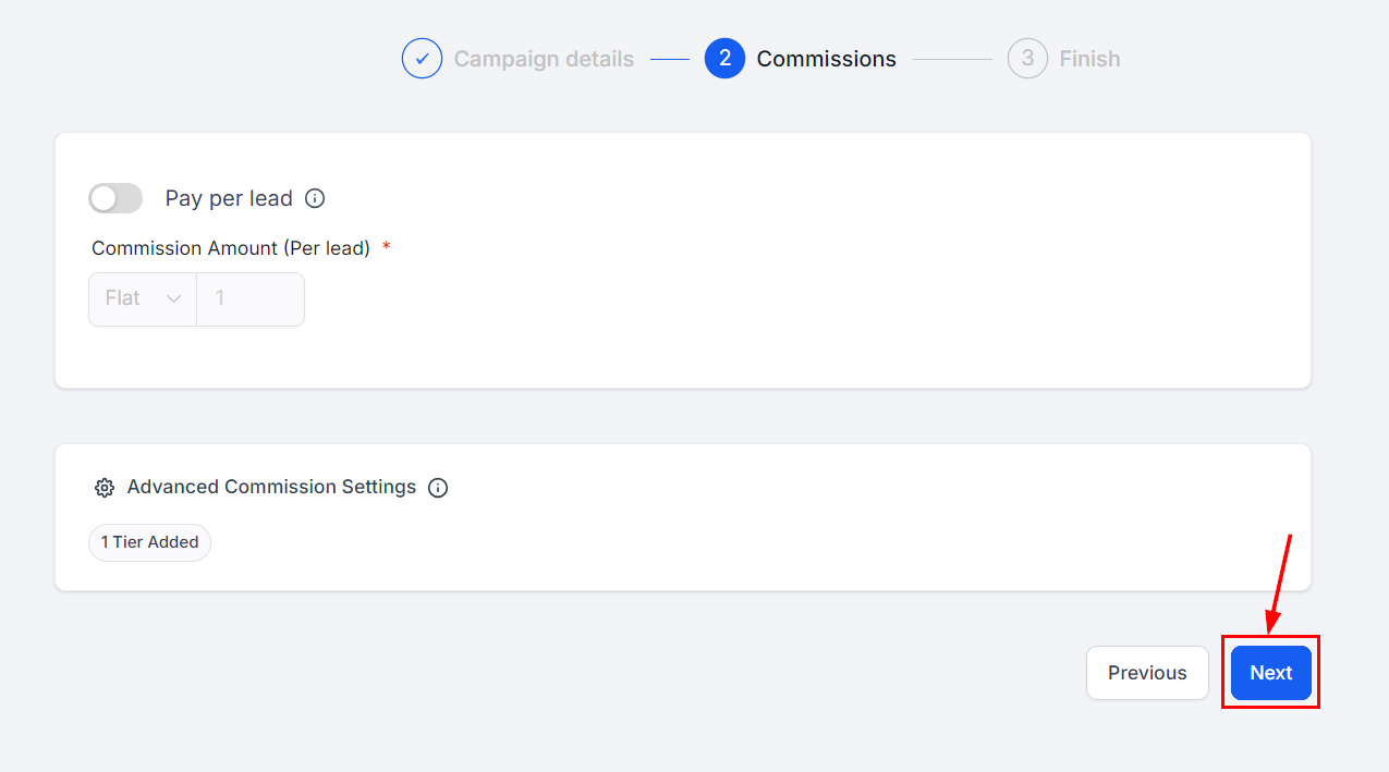 In the Commissions section, you can set up commission amounts, define tiers, and configure pay-per-lead structures. Click the βNextβ button to finalize the campaign.