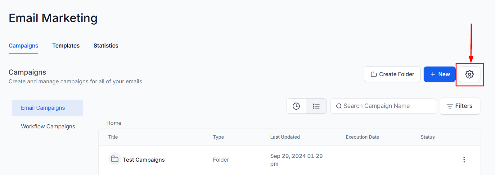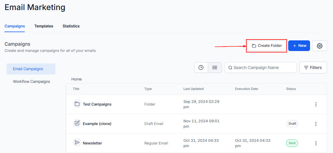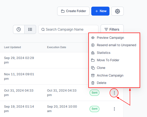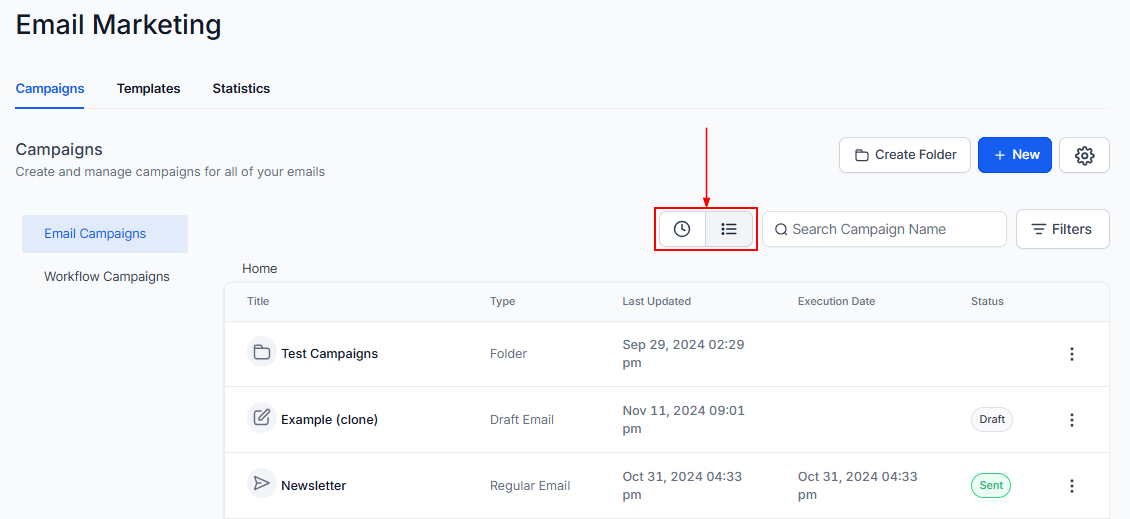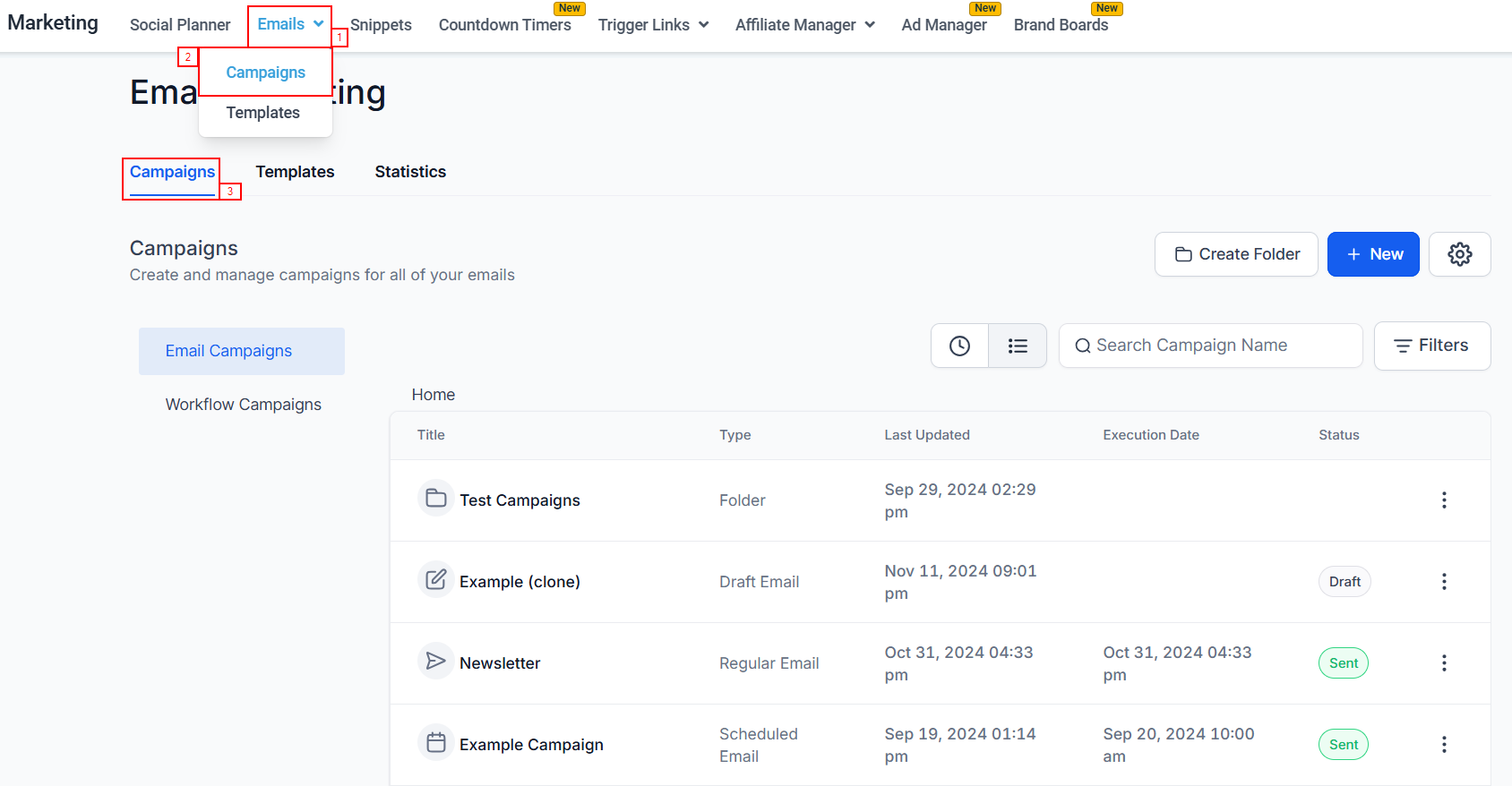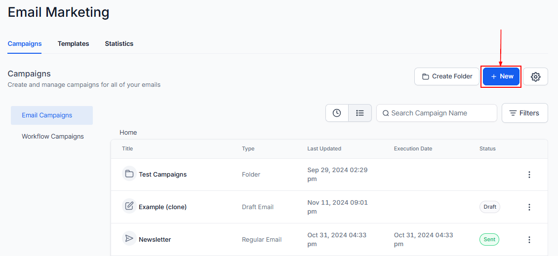 Start a brand-new campaign by clicking the +New button. Whether it's a promotional email, a newsletter, or a follow-up email, you can design and customize the content to meet your specific goals.