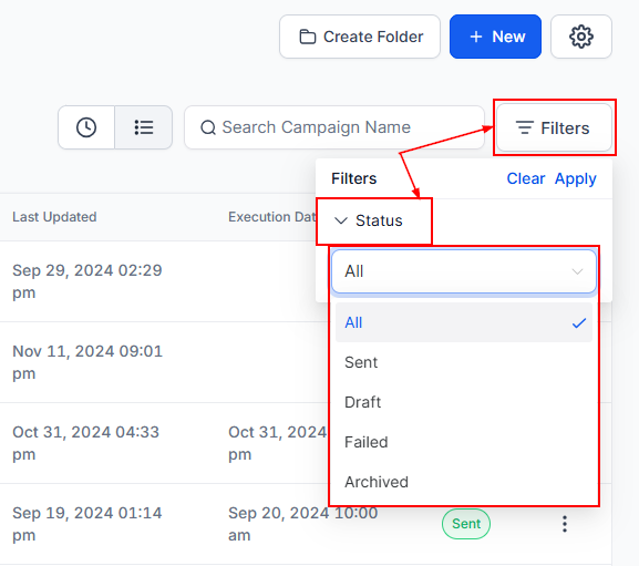 With this option, you can view specific campaign/campaigns based on their status, which include: