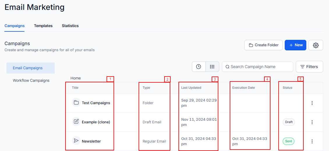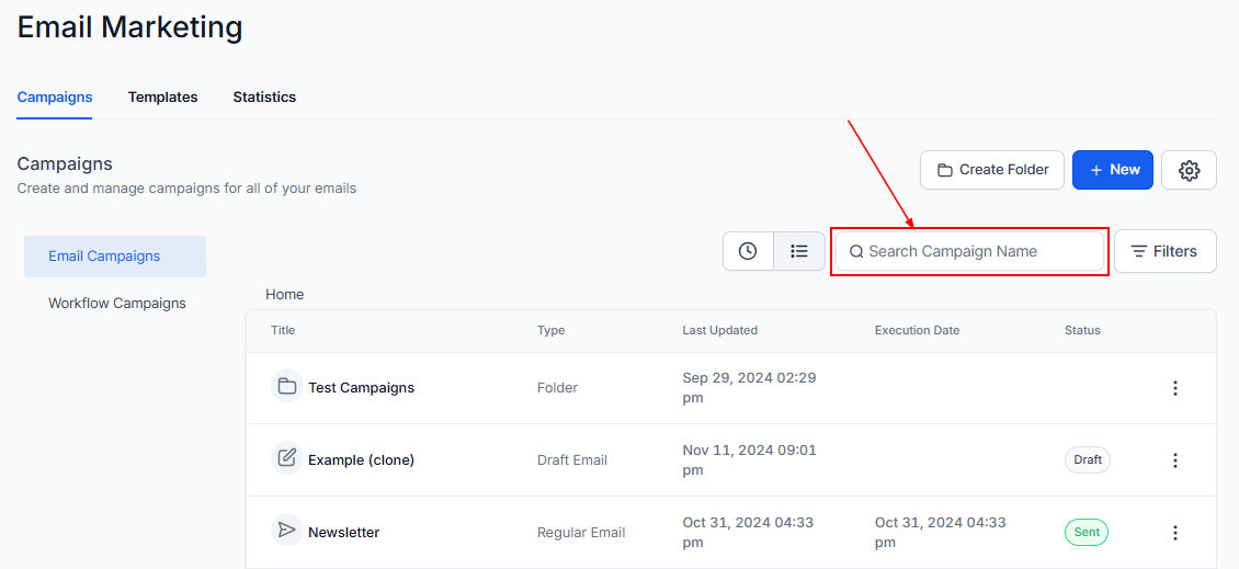 With tools like search functionality, organized folders, and detailed statistics, you can efficiently track and refine your efforts. By using features like campaign status filters and action menus, you can ensure your email marketing strategy stays effective and organized.