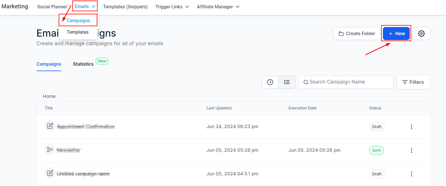 Navigate to Marketing > Emails > Campaigns. Click the βNewβ button to create a new campaign.