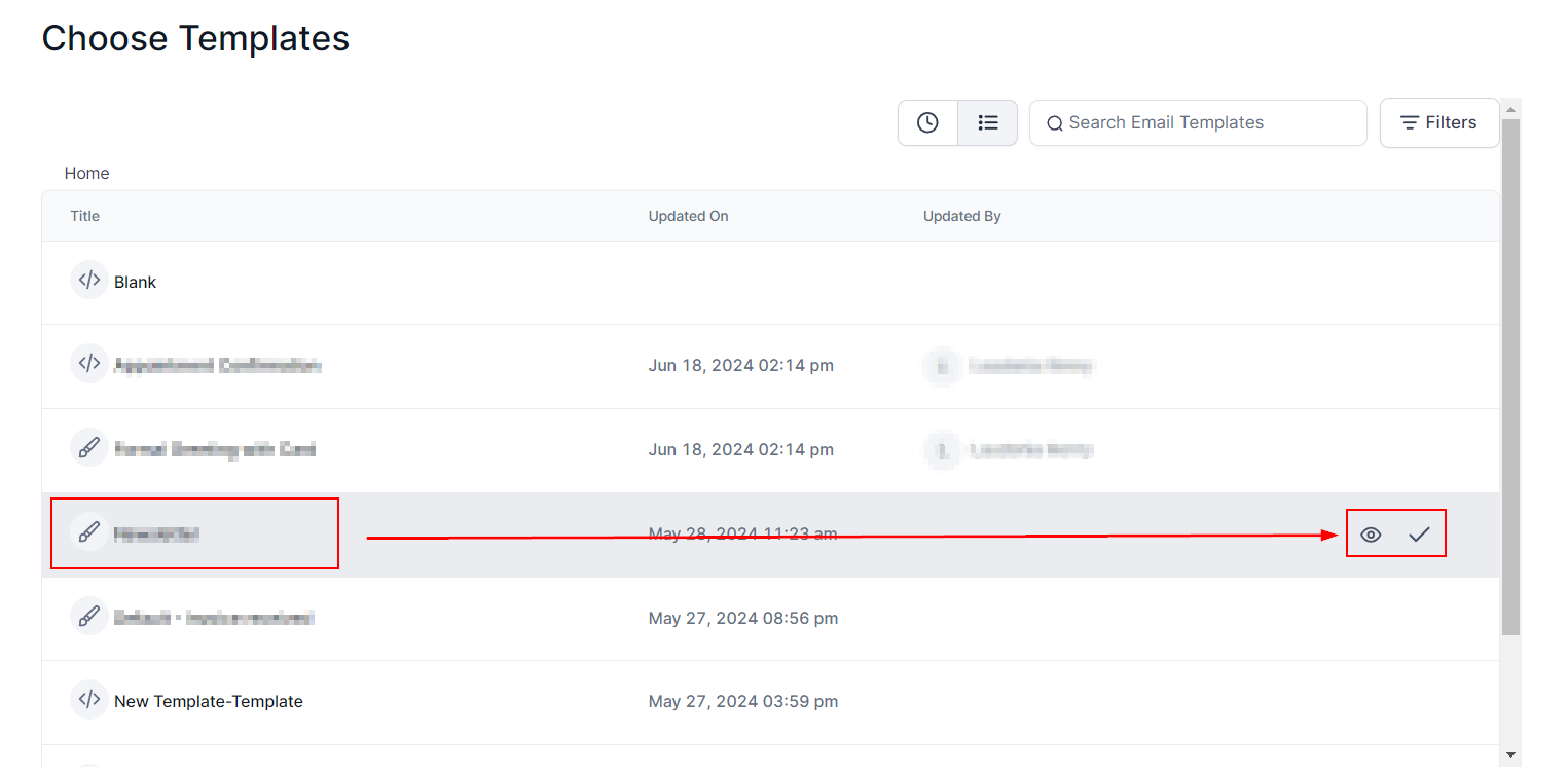 Choose the template for your marketing email campaign. Preview options are available for template verification.