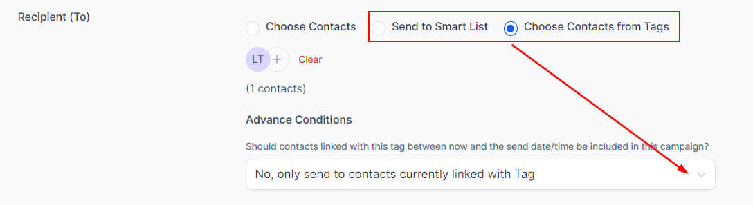 Select the contacts you want to send it to, if you are sending to a Smart List or Tag you can select to limit it to only the selected contacts or include any new ones that come into the system before the Send date/time.