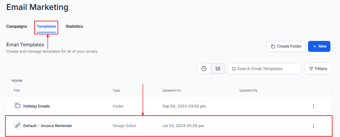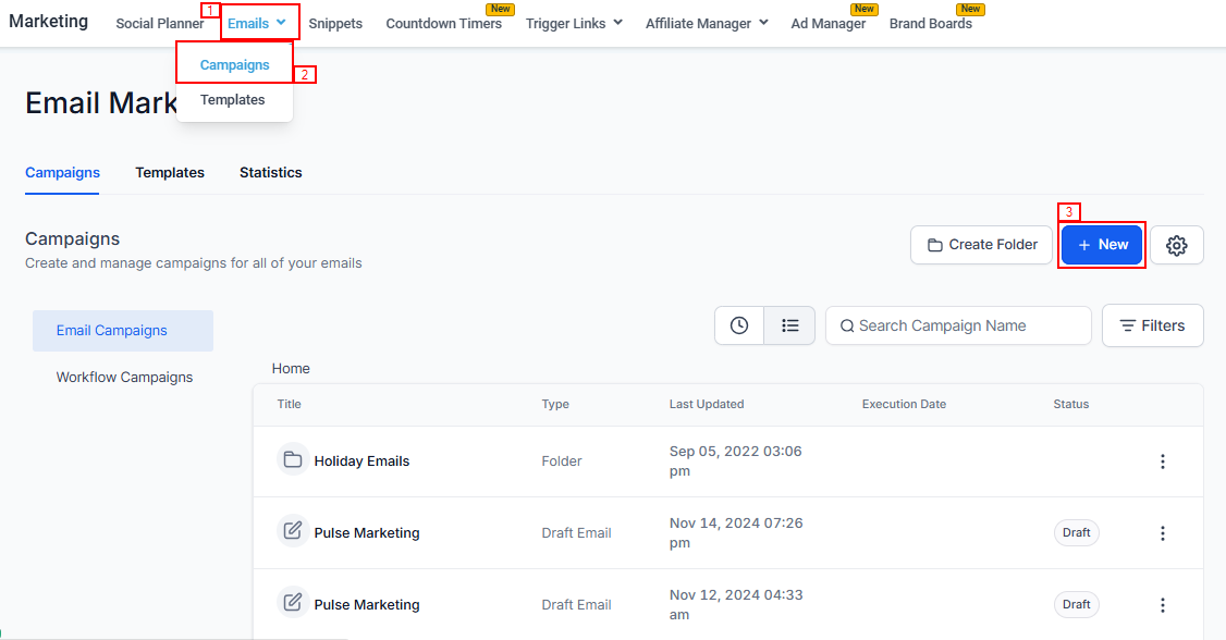 Head over to Marketing β Emails β Campaigns section of your CRM. Select the βNewβ tab at the top right corner from there.