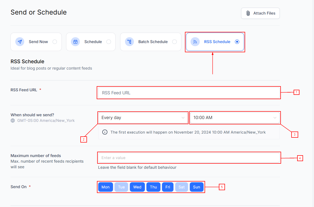 Time: Set the time for the RSS email campaign. Your campaign can be scheduled and sent on the same day.
