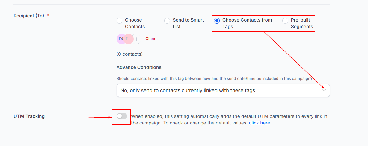 UTM Tracking: The toggle switch allows you to enable or disable UTM tracking for your email campaign. When enabled, UTM parameters are automatically added to every link within the campaign.