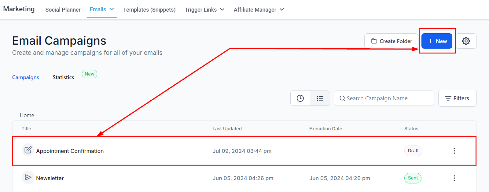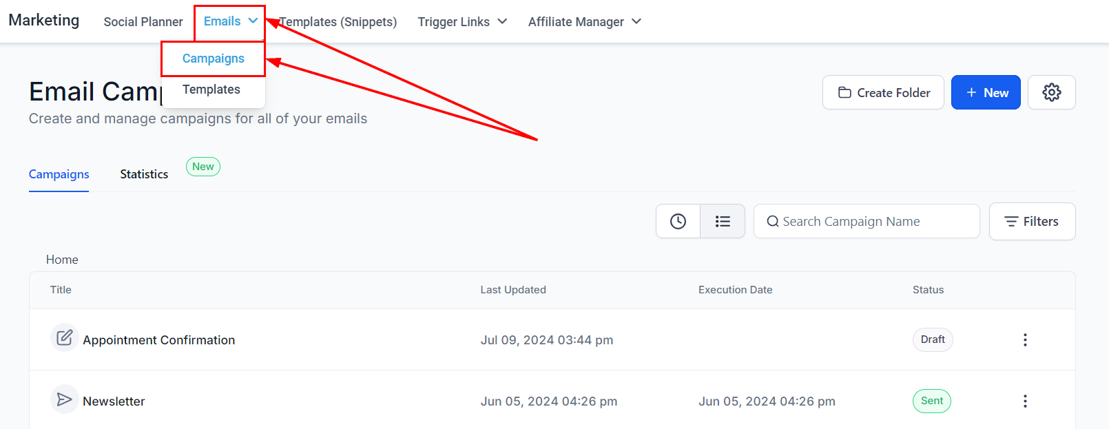 Navigate to the "Marketing" section, and select "Emails" followed by βCampaigns.β
