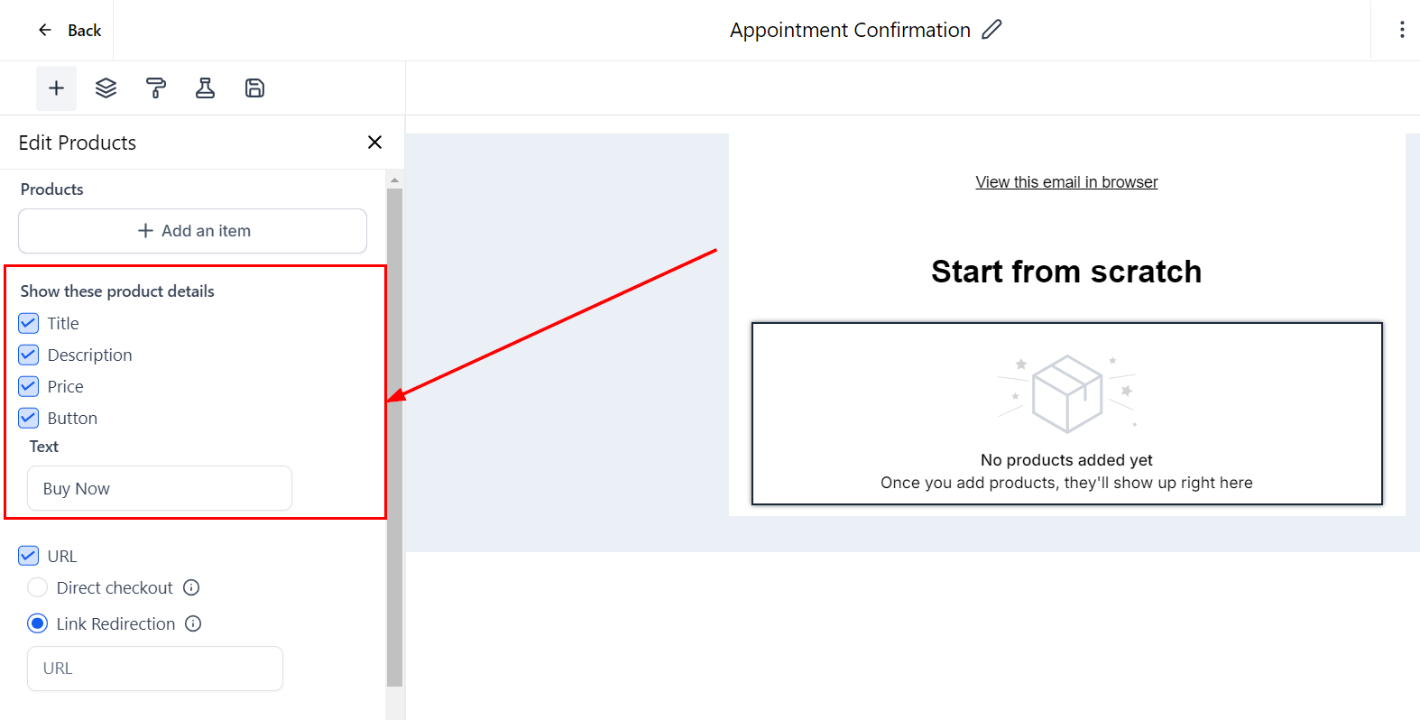 Customize how your product catalog will appear in your email by choosing design options. You can decide whether to display titles, descriptions, prices, and even change button names.