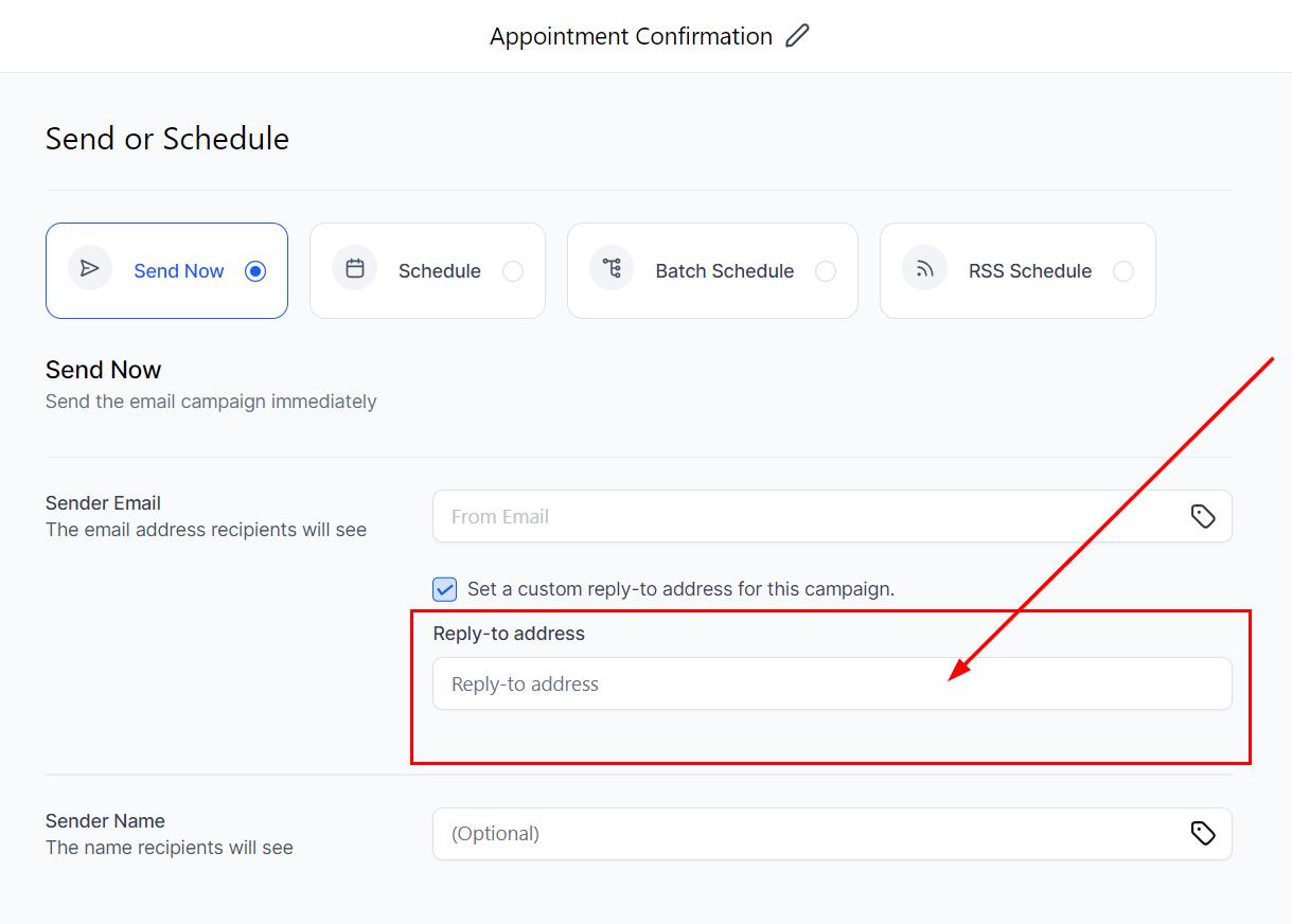 1. Custom Reply-To Address: Set in the campaign’s Send or Schedule screen.