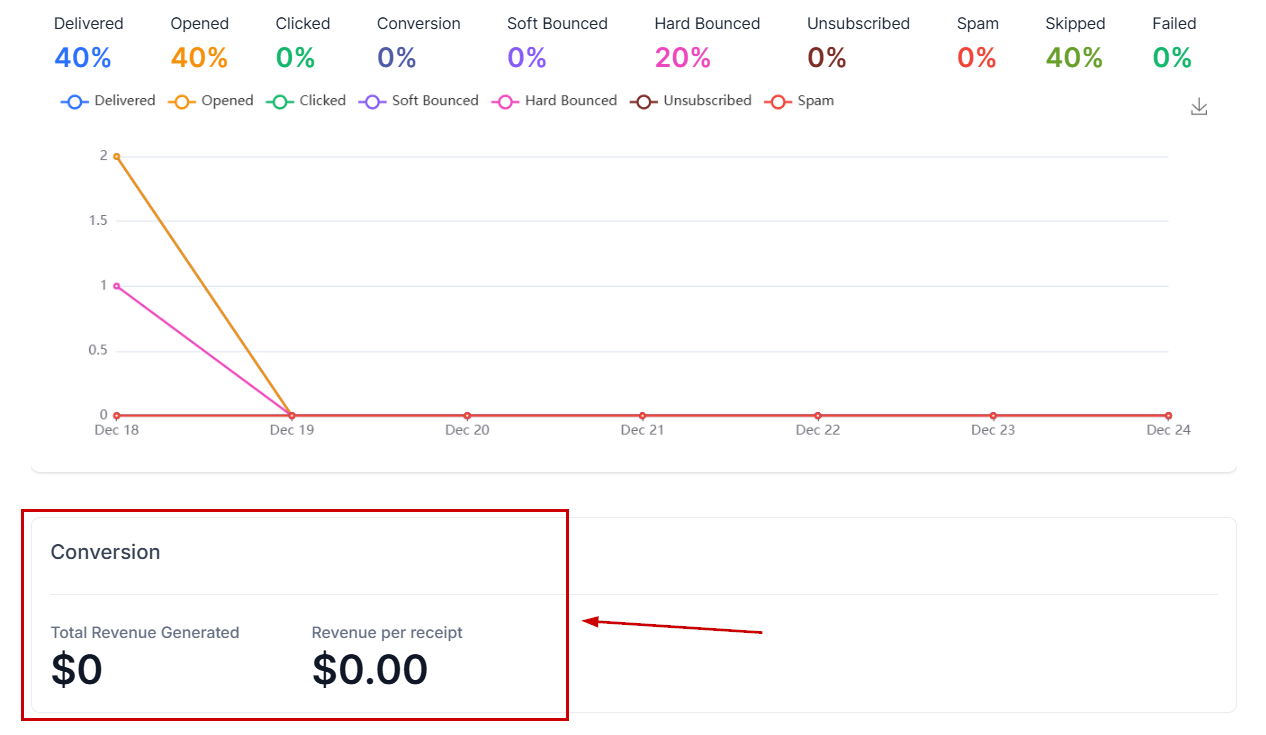 In the conversion section, you'll find "Total Revenue Generated" and "Revenue per Receipt". This provides a snapshot of your campaign's financial impact.