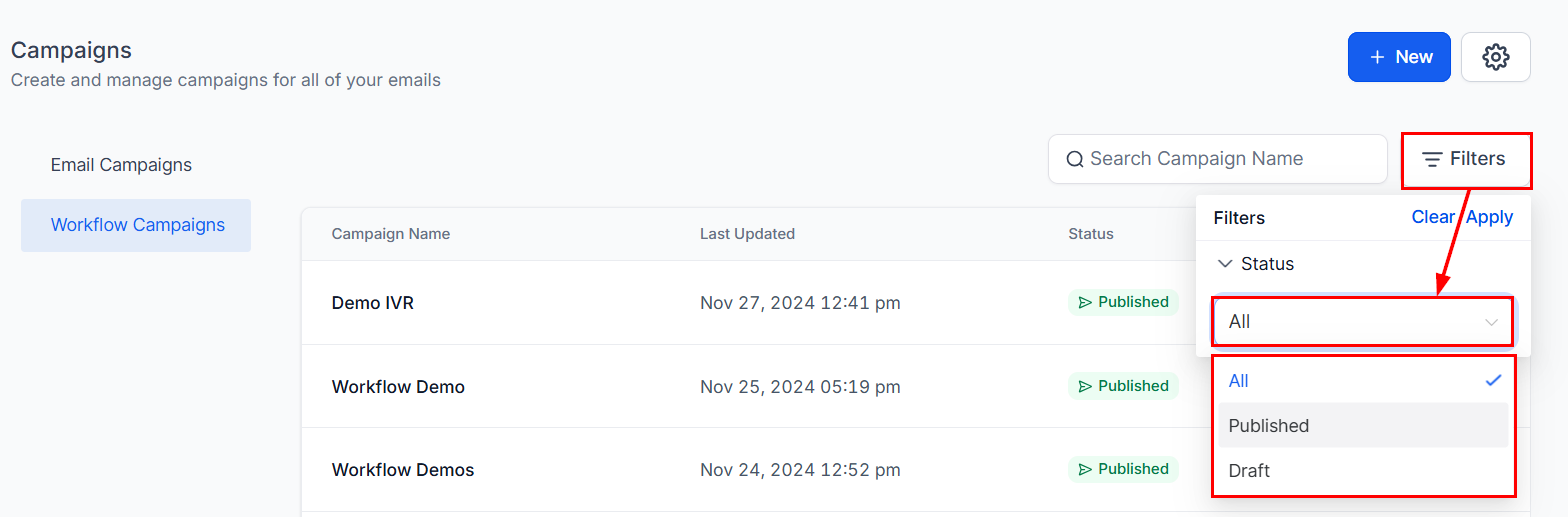 Use the Status filters to refine the list and display workflows based on their specific status.