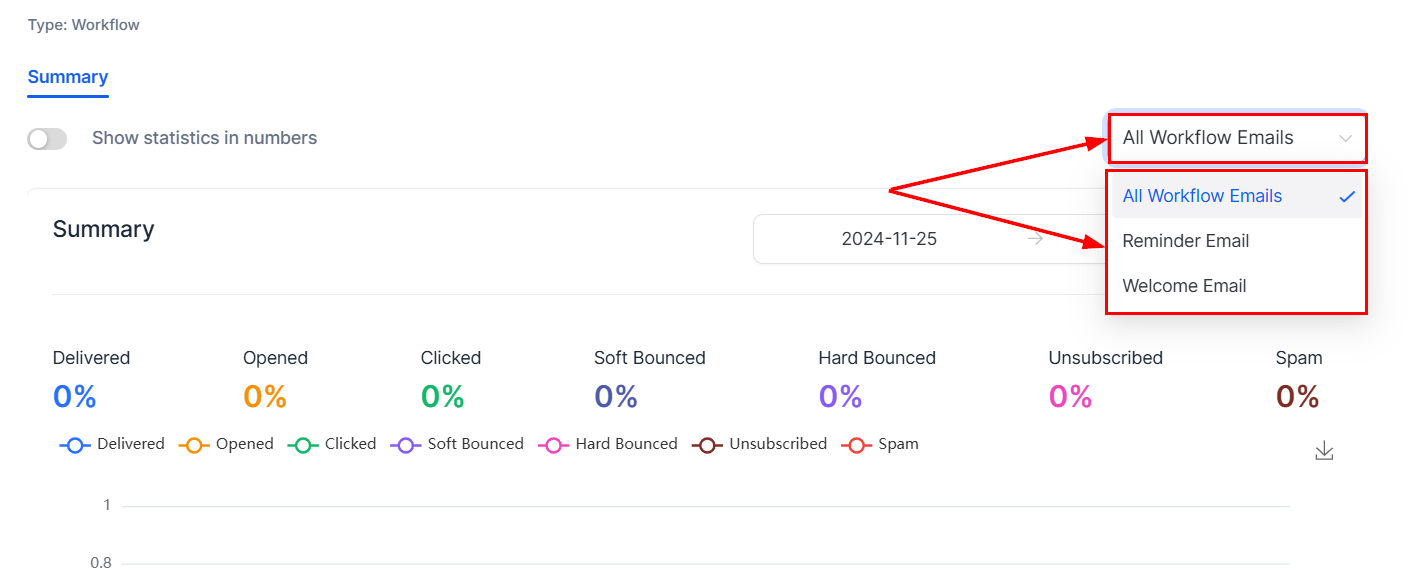 Workflow Campaigns provide an overview of your email action performance within a workflow. By consolidating both overall and individual email action statistics into a single, organized view, this feature allows you to analyze the effectiveness of each email action in detail.
