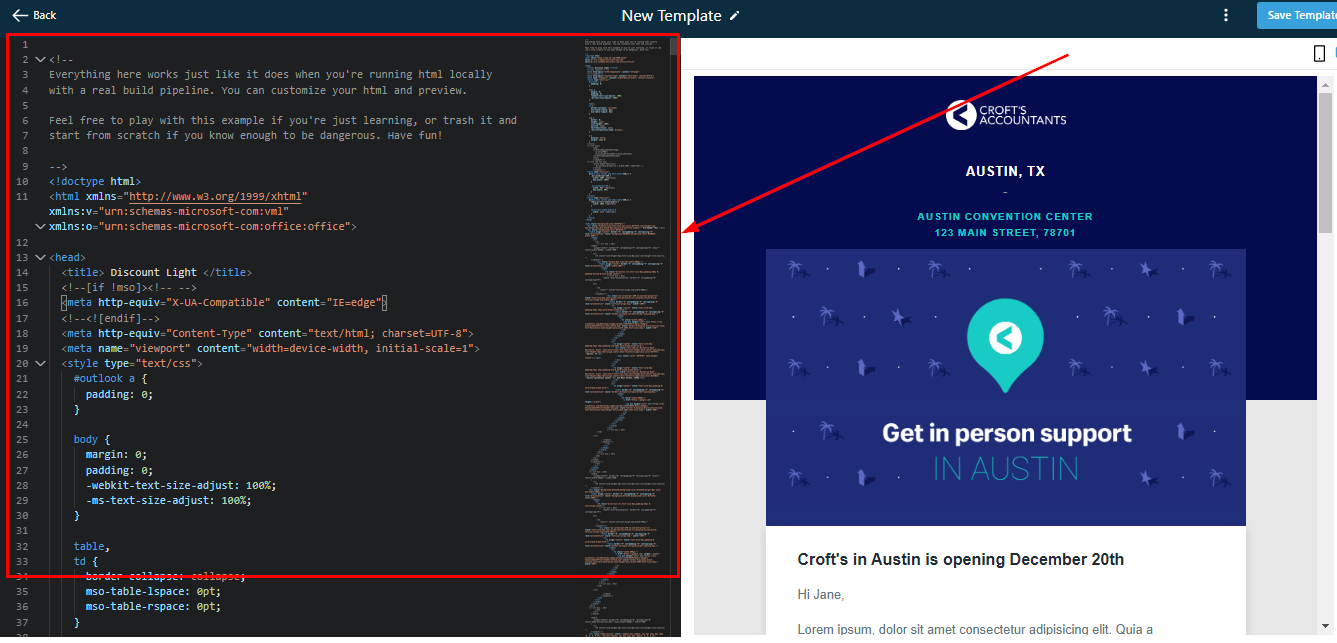 This feature allows for greater flexibility and precision in designing email layouts, enabling users to implement advanced design elements and personalized styling that may not be achievable through a standard drag-and-drop editor. By using the Code Editor, users can ensure their emails are tailored exactly to their specifications, providing a highly customized and professional appearance.