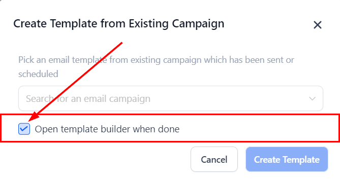 To edit the duplicated email template after its creation, enable the βOpen Template Builder When Doneβ option.