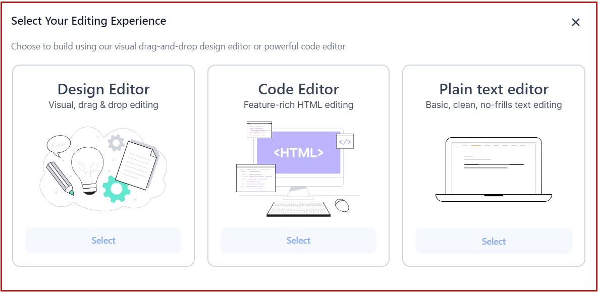 This option provides a blank canvas, giving you complete freedom to design and customize the email layout and content according to your specific requirements and branding needs, without any predefined structure or elements. Choose to build using our visual drag-and-drop design editor, powerful code editor, or our plain text editor.