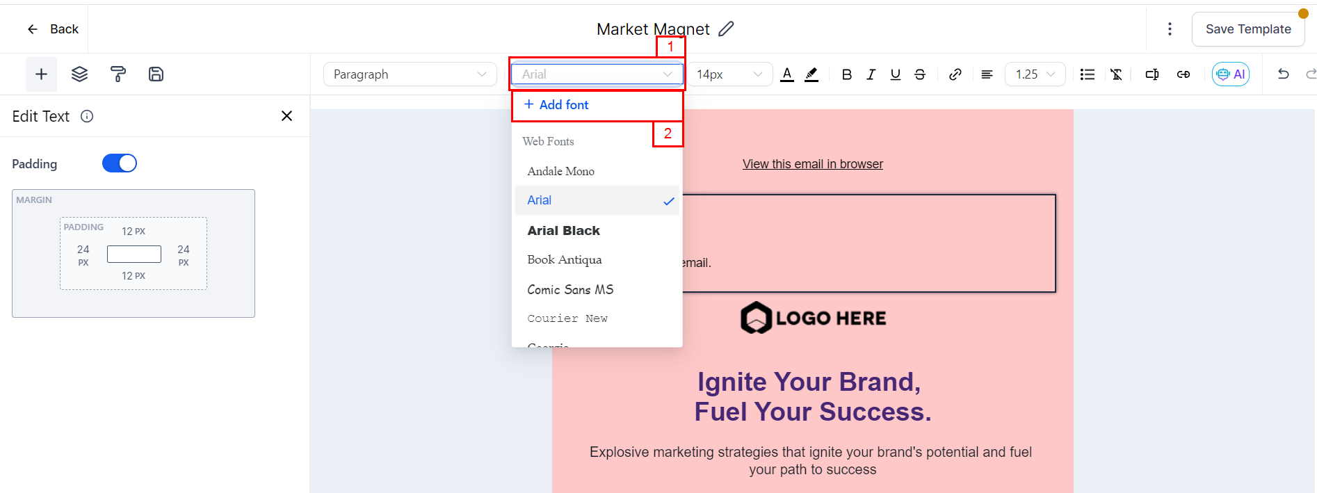 Click on the font selector located in the upper panel of the email builder. This action will prompt a dropdown menu featuring a selection of system fonts. To incorporate a new font, simply press the "+ Add Font" button.