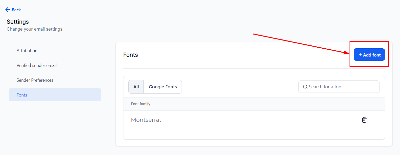 After adding your font, you can manage it by selecting the Settings icon under Emails > Campaigns.