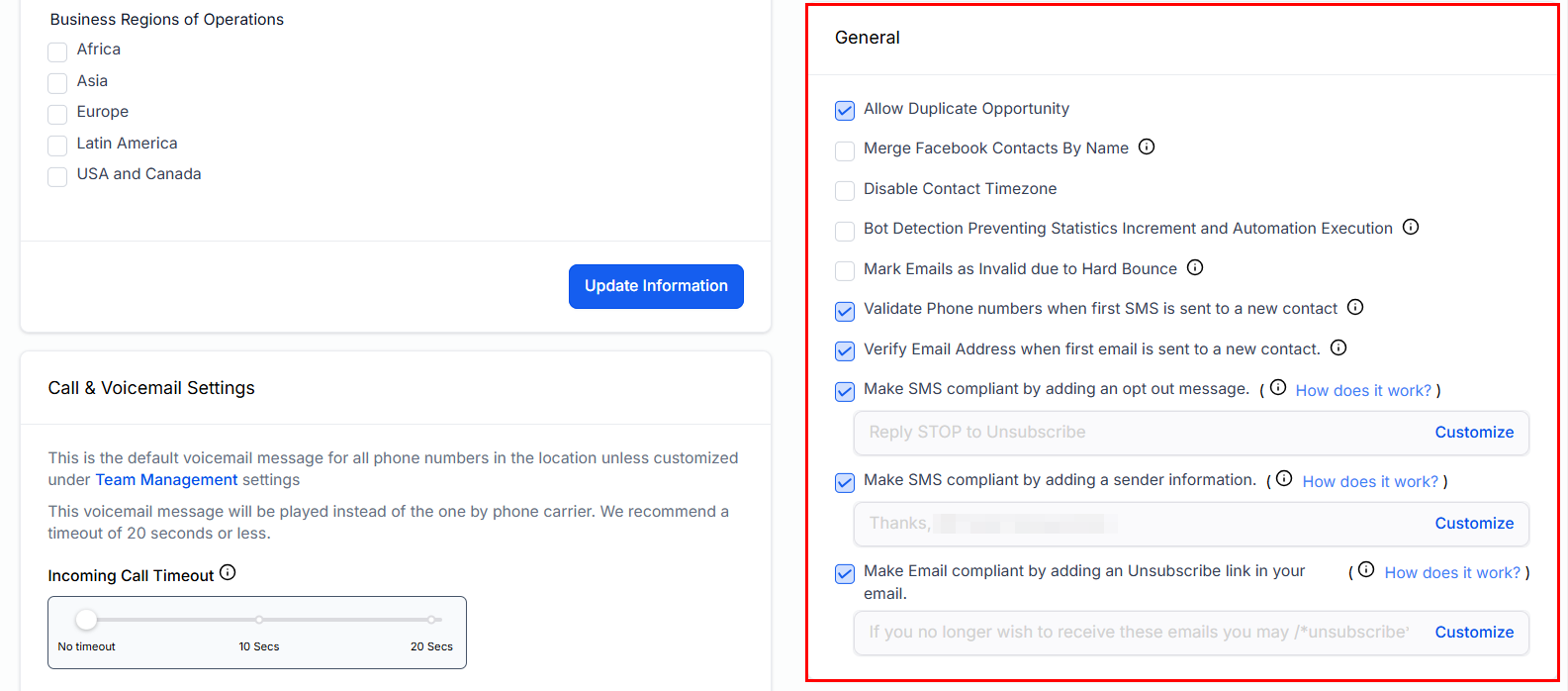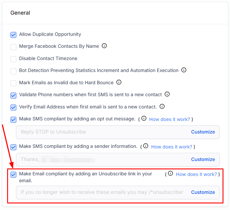 Locate the option labeled βMake email compliant by adding an unsubscribe link in your email.β If this option is currently disabled, enable it to ensure an unsubscribe link is automatically included in all emails sent from the system.