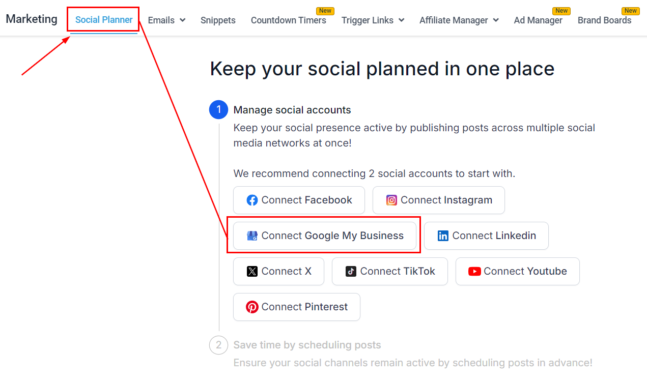 To get started, log into your account go to the Marketing tab, and click on Social Planner. If you havenβt connected to any social accounts yet, you will have the option to select GMB from the icons.
