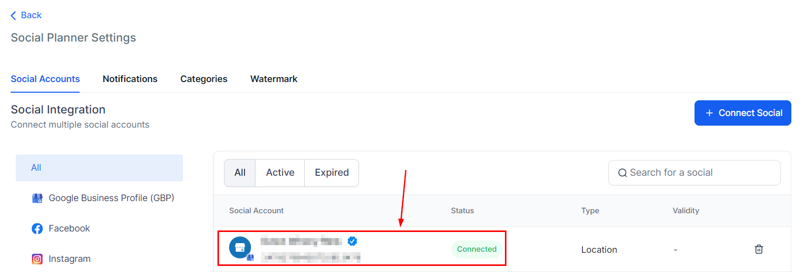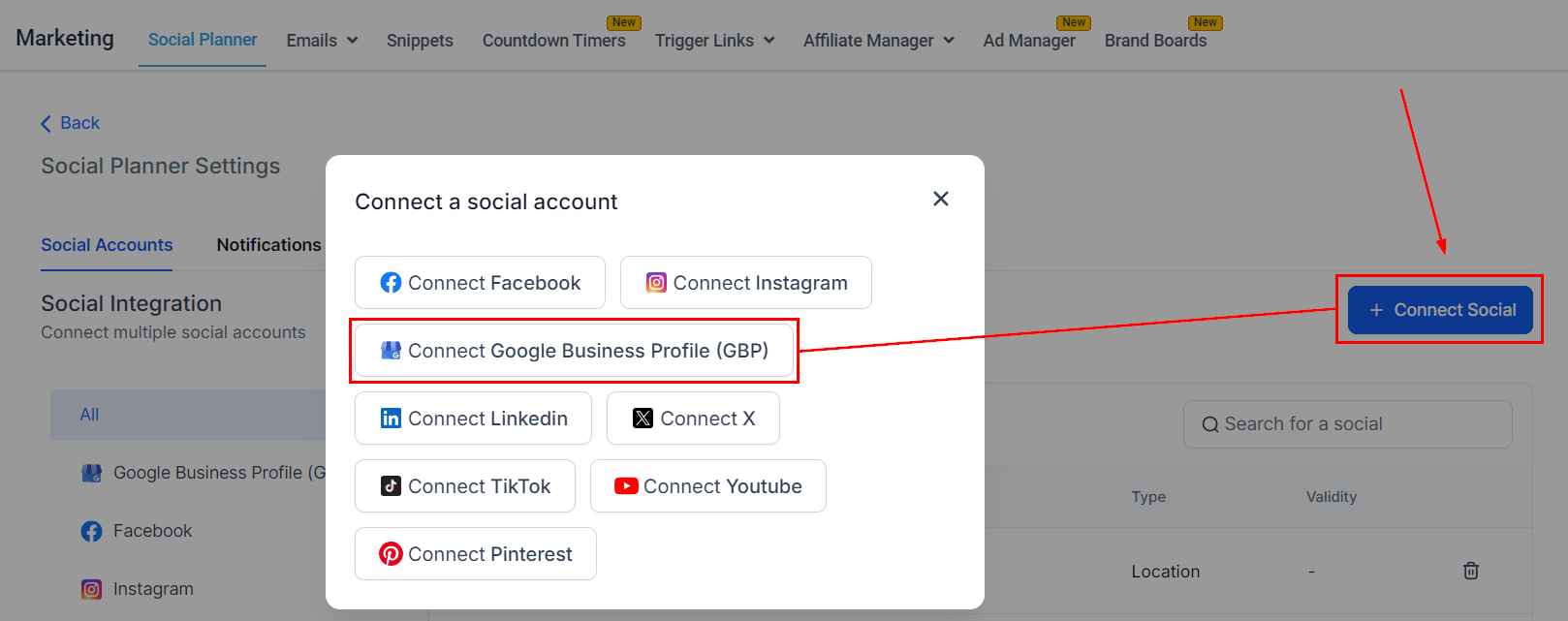The next step is to click on the "Connect Social" button as shown below to manage multiple GMB locations. Once youβve clicked on it, you will see the option to add the GMB locations select it, and connect the account(s).