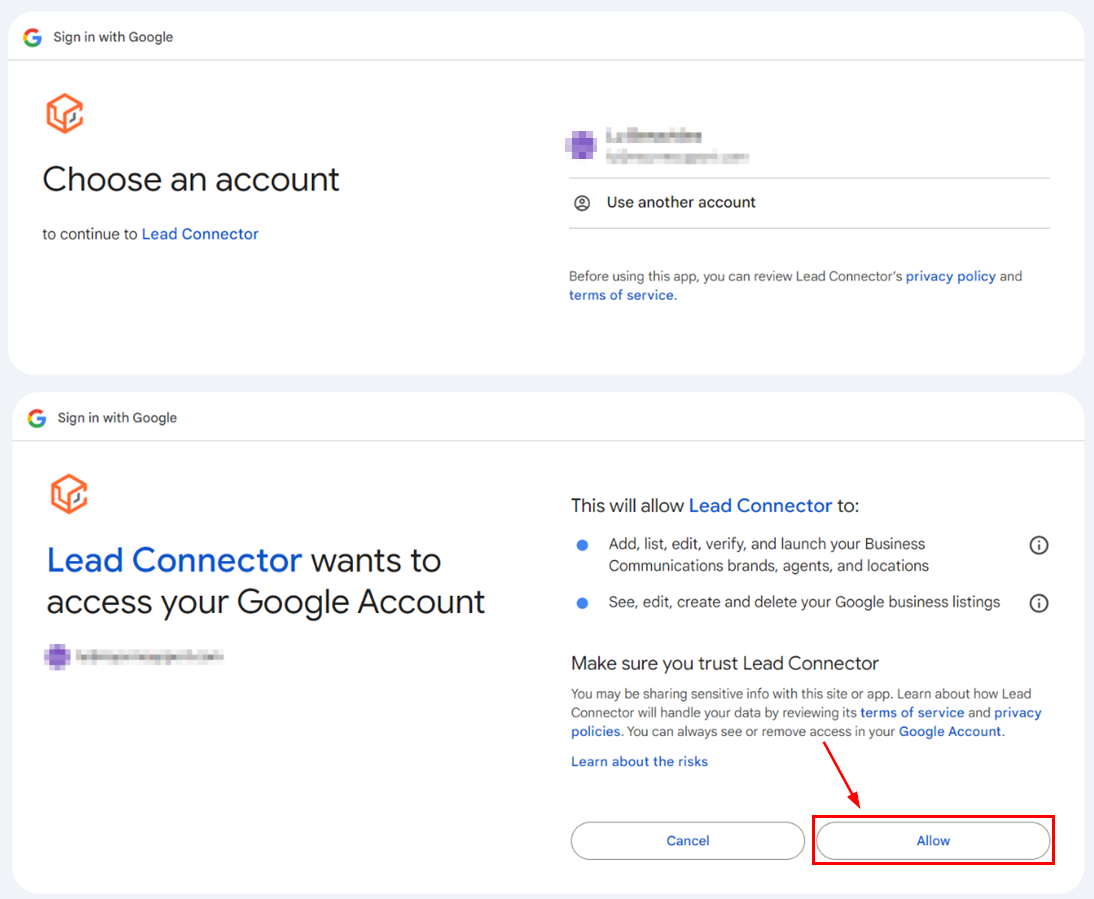 You will then be prompted to choose the Gmail account your GMB pages are linked to and provide Lead Connector with the permissions for connecting with the social planner. Choose the GMB locations you would like to add and click allow.
