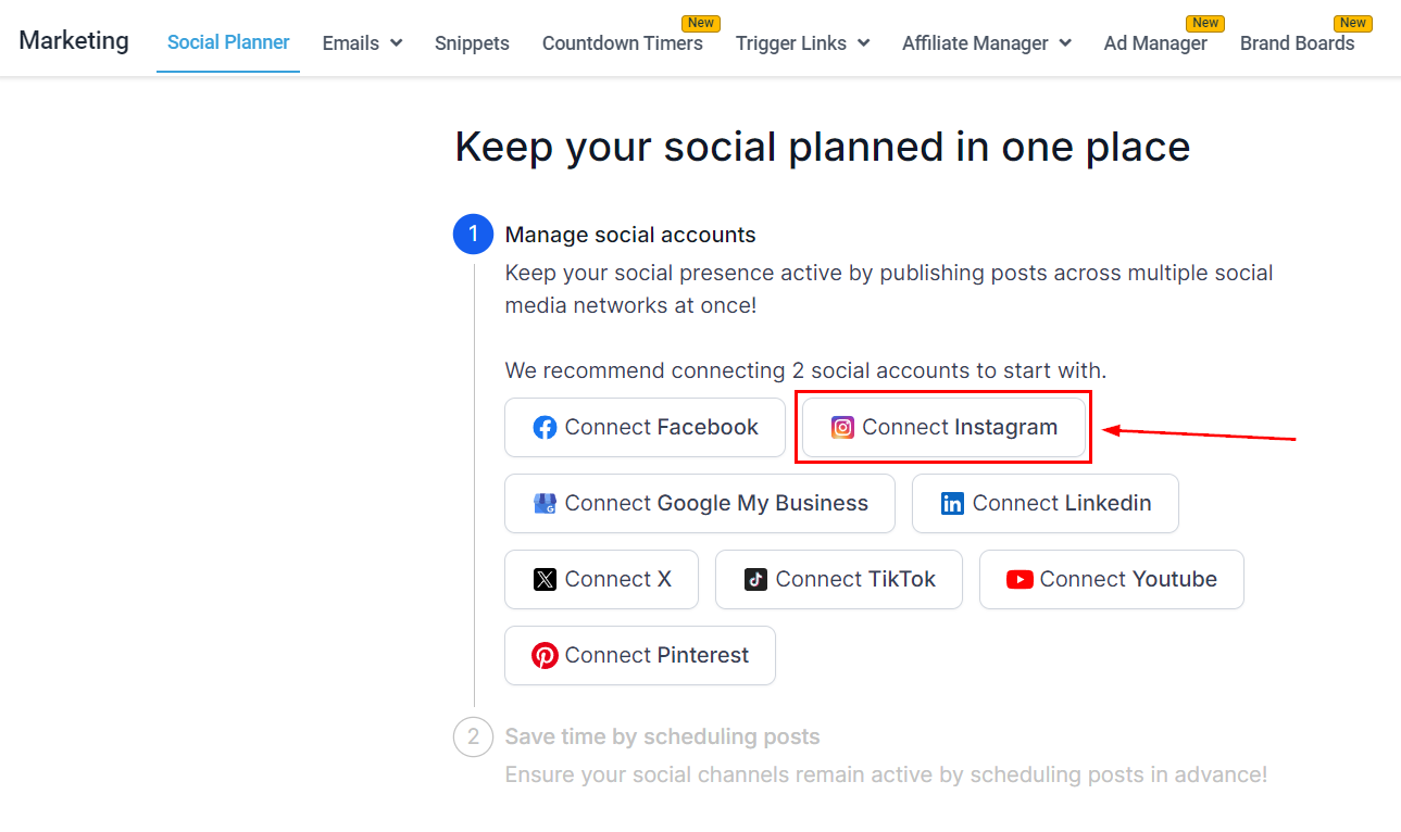 If you haven't connected any social media accounts, click the Instagram icon in the wizard with the Connect option to begin setting up.