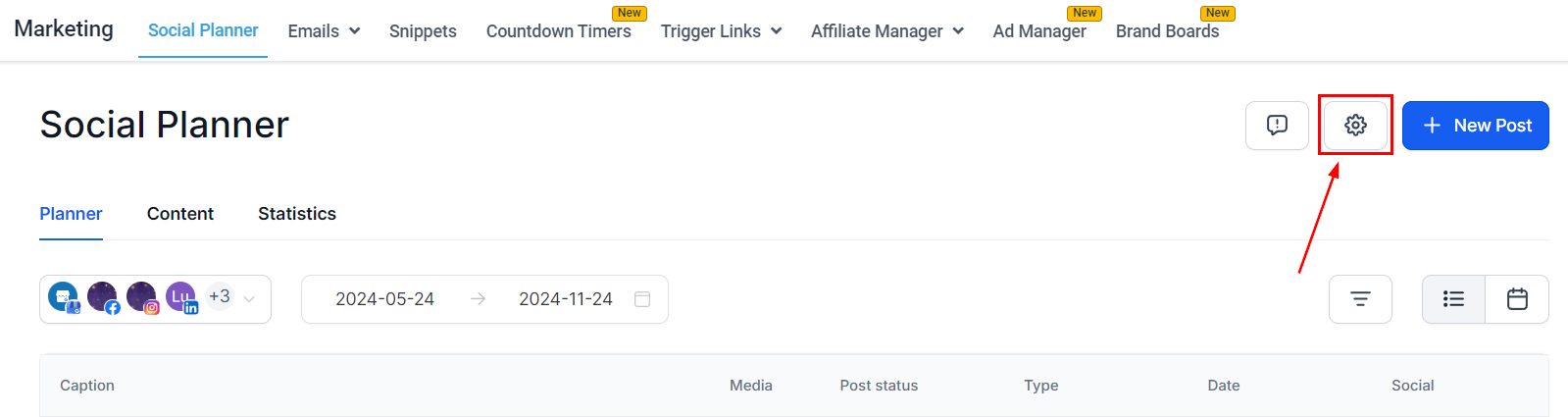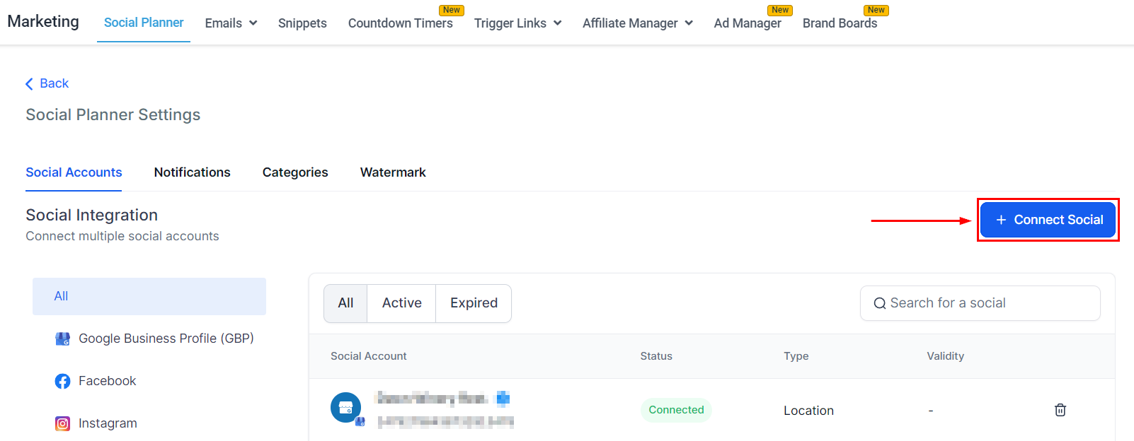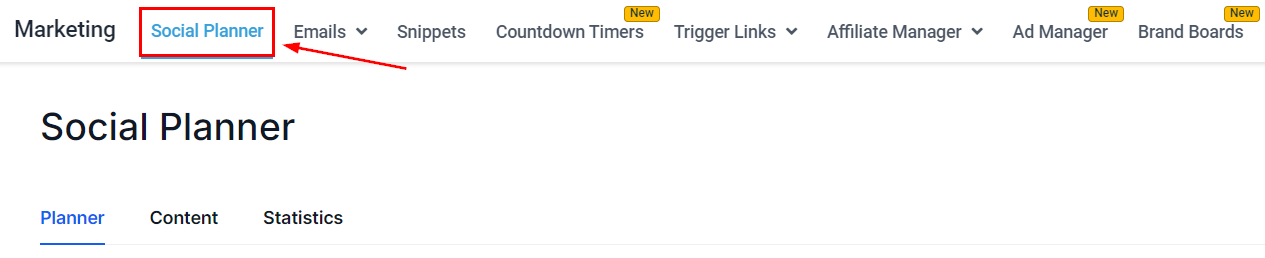 If you haven't connected any social media accounts, navigate to the Social Planner tab inside the Marketing section.