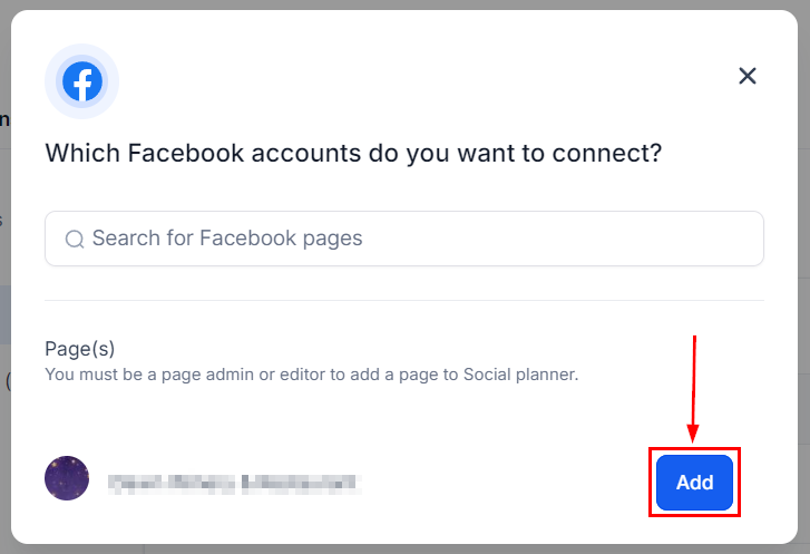 Select the Page(s) you'd like to connect by clicking Add. Once connected you'll be able to check the account and schedule posts.