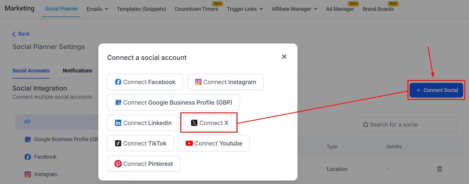 After clicking the Connect Social button, there will be an option to add a Twitter account.