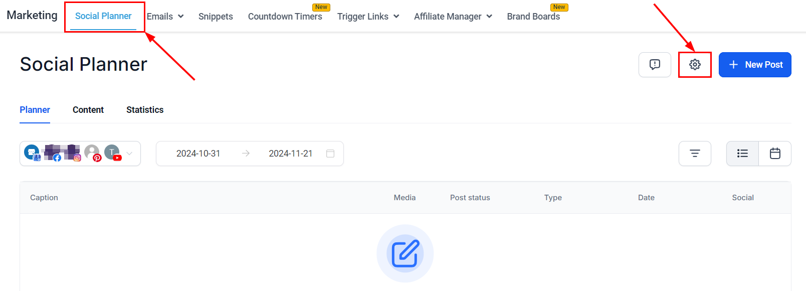 Navigate to the social media planner by selecting 'Marketing' on the left sidebar, then 'Social Media Planner' at the top. Click on the settings icon located on the right to find the watermark section.
