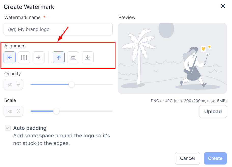 Choose the watermark's alignment (left, right, center, top, or bottom) and adjust its position as desired.