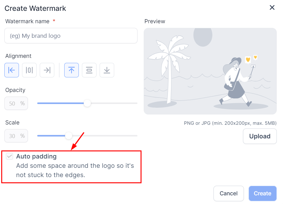 Enable or disable the auto-padding feature, which controls the space between the watermark and the edges of the image. Auto-padding helps maintain a balanced appearance by preventing the watermark from being too close to the edges.