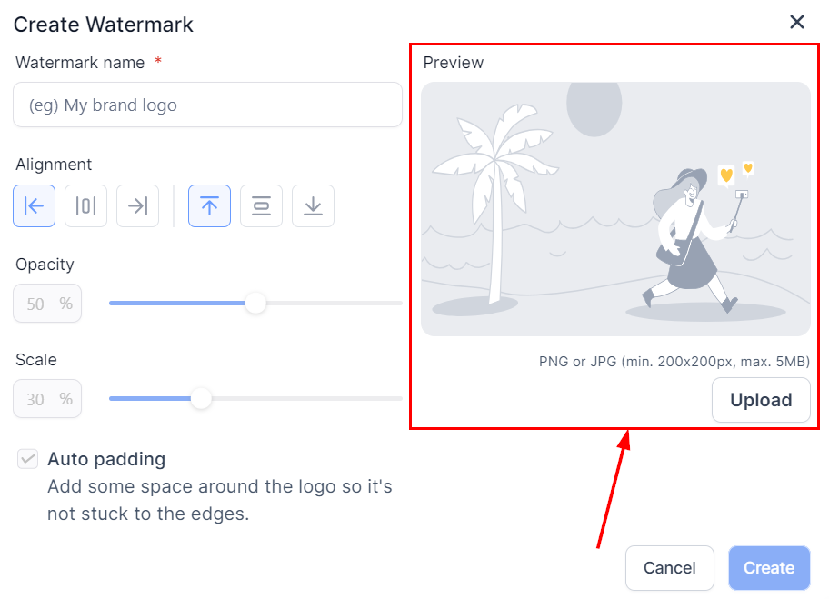 Upload the image you want to use as your watermark. For the best results, ensure the image is 200x200 pixels. Once you have uploaded your image, preview it in the section above.