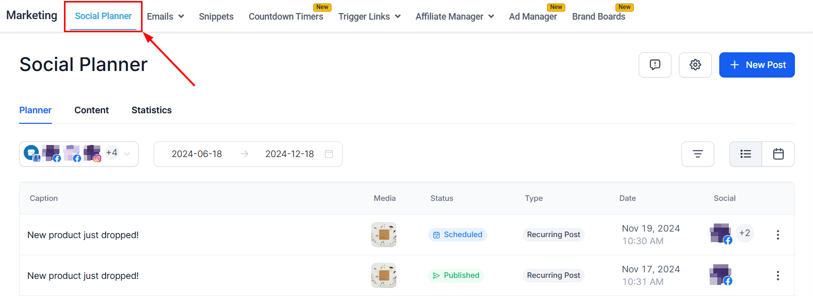 Navigate to the Marketing section in your dashboard, then click on Social Planner.