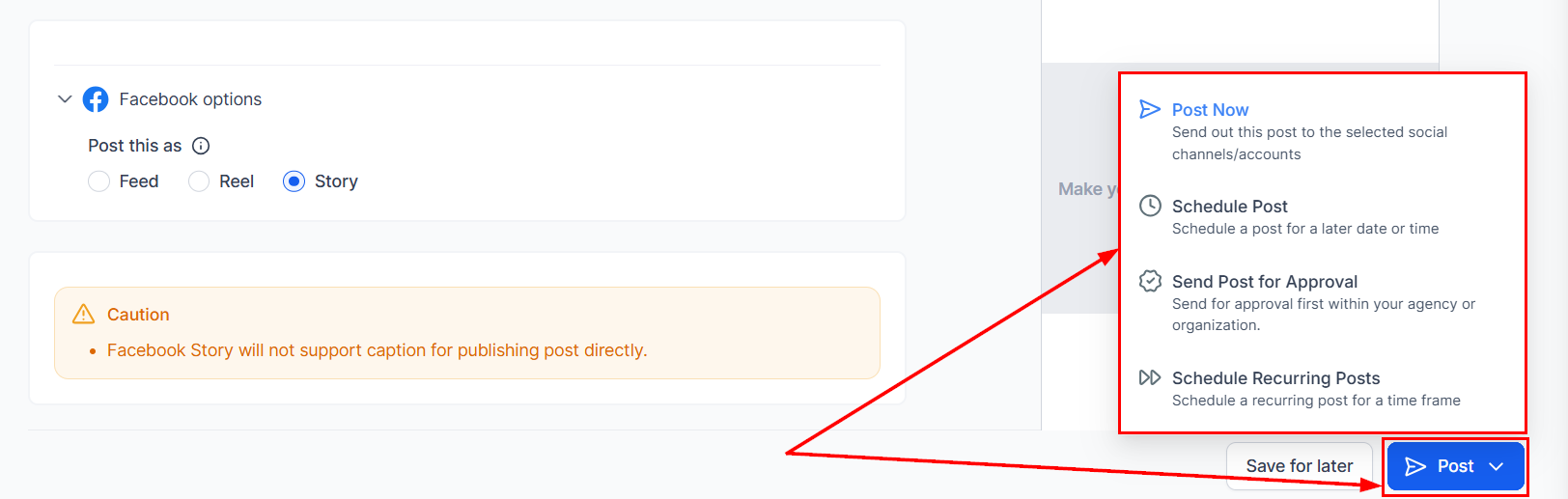 Once you've finalized your content, click Post to set a specific time and date for your story to go live. Alternatively, you can publish the story immediately.