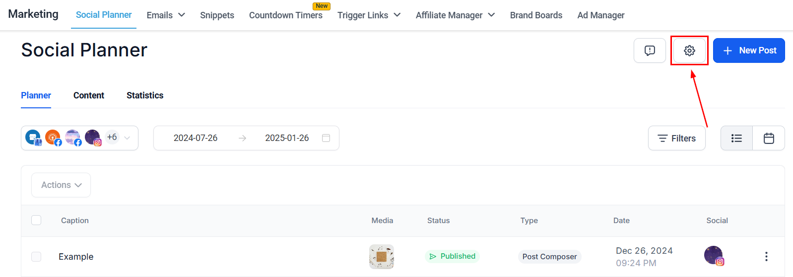 Navigate to the Social Planner inside the Marketing section and click the gear icon to access the settings.