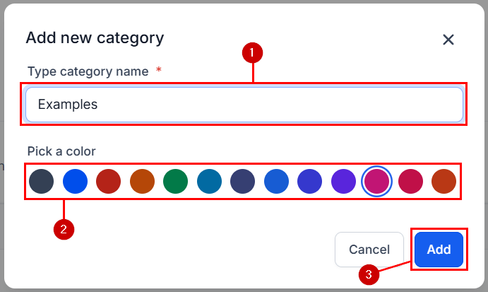 Give a name to your category pick a color for it, then click Add