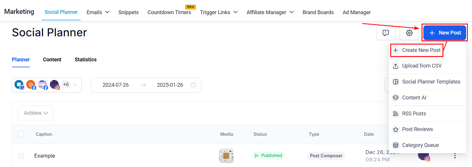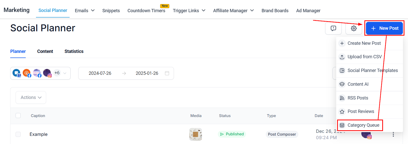 Navigate to the Social Planner inside the Marketing section, click +New Post then select Category Queue.