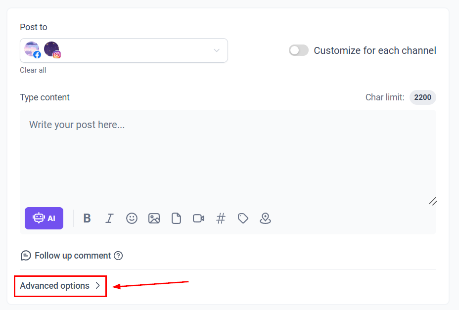 Once you're inside the post-builder and you've selected the socials you want to post scroll to Advanced Options.