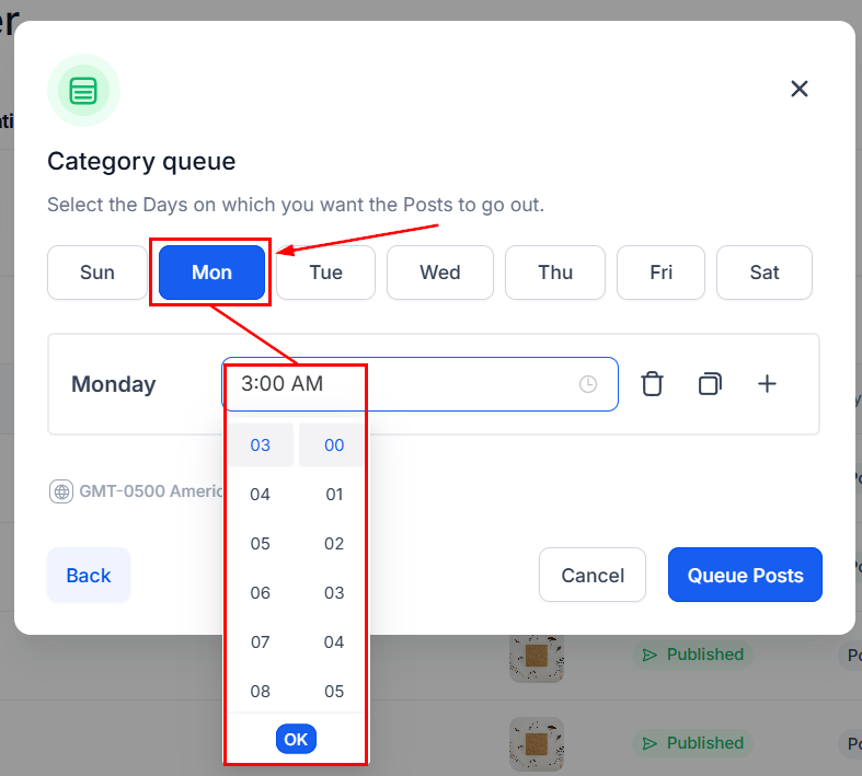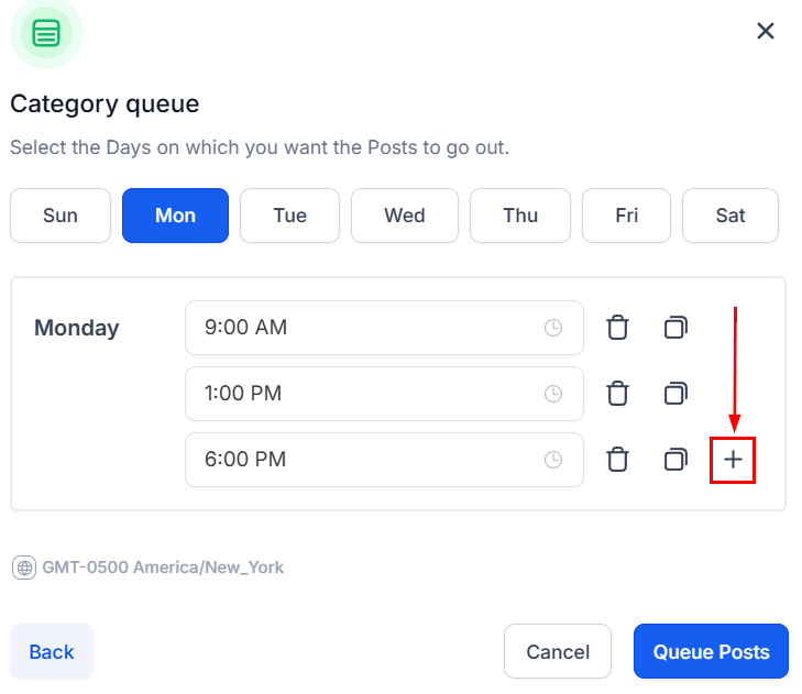 Select the preferred Days by clicking on them, then add the times you'd like the content to be posted.