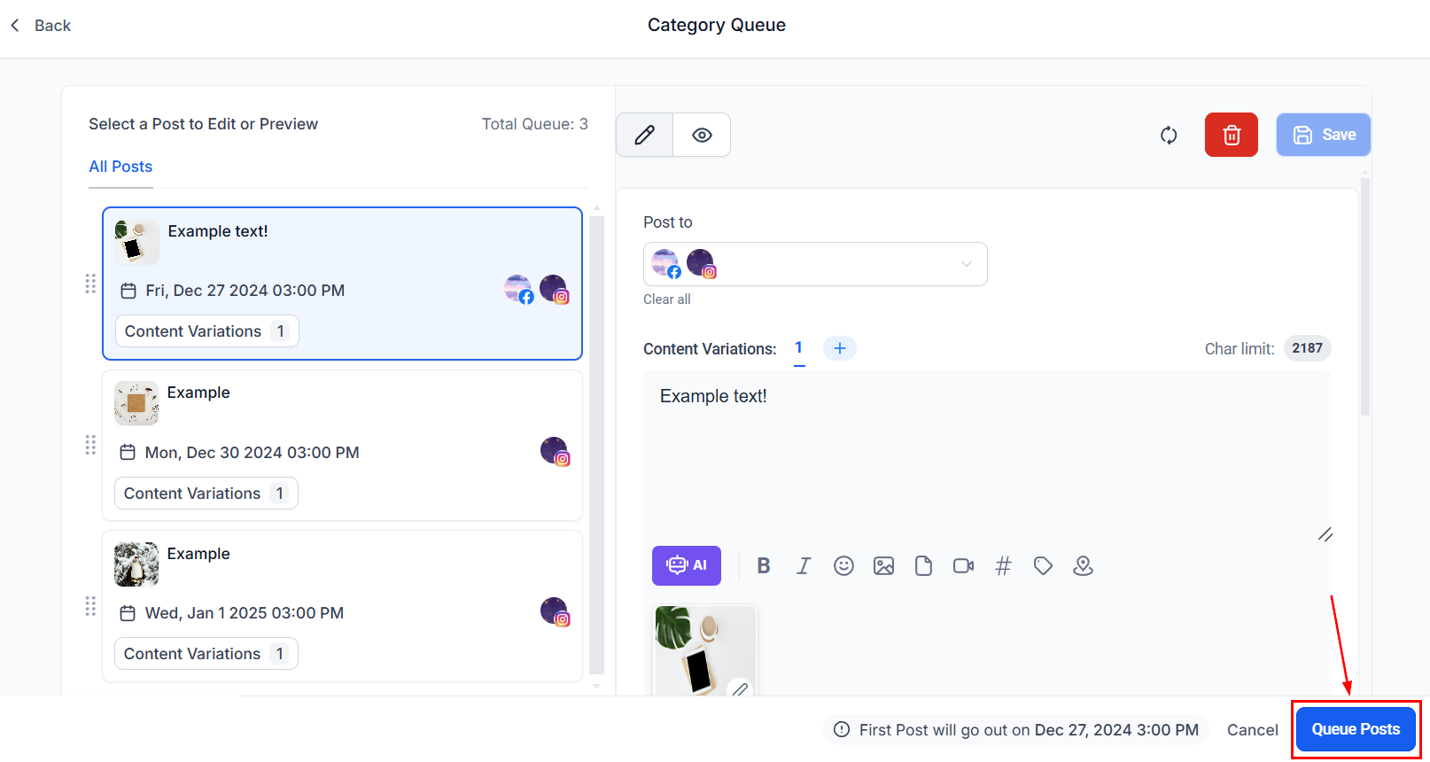 Once satisfied, click Queue Posts to schedule the content.
