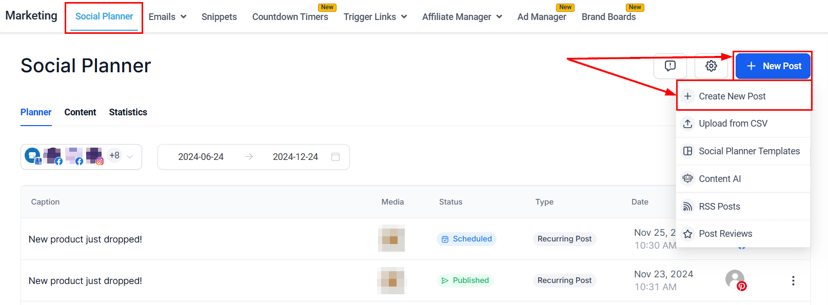 Navigate to Marketing > Social Planner in your account. Select Create New Post and choose your desired social channels.