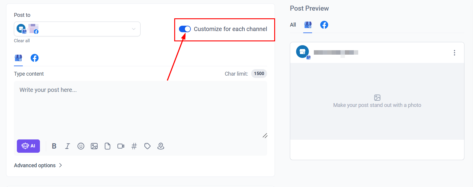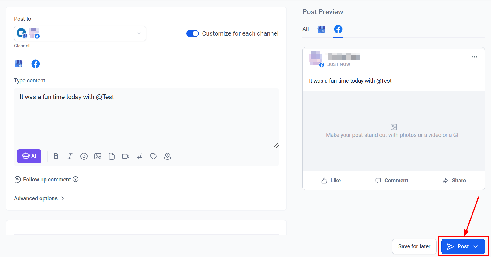 Complete your post by configuring the advanced options, then publish it based on your desired settings. When multiple social channels are selected, the system prompts you to customize the post for each channel.