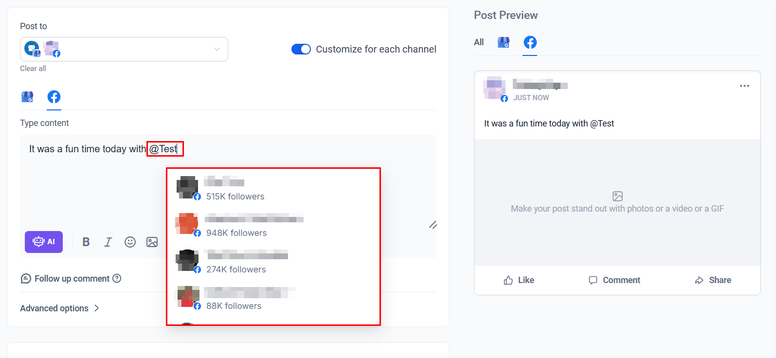 If youβre posting to multiple platforms, enable the option to Customize for Each Channel to tailor the mentions to the platform.