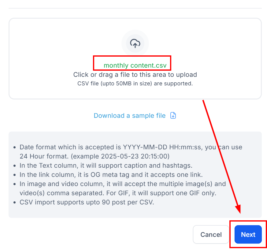 Ensure that the CSV follows the required format. A maximum of 90 posts can be uploaded per CSV file.