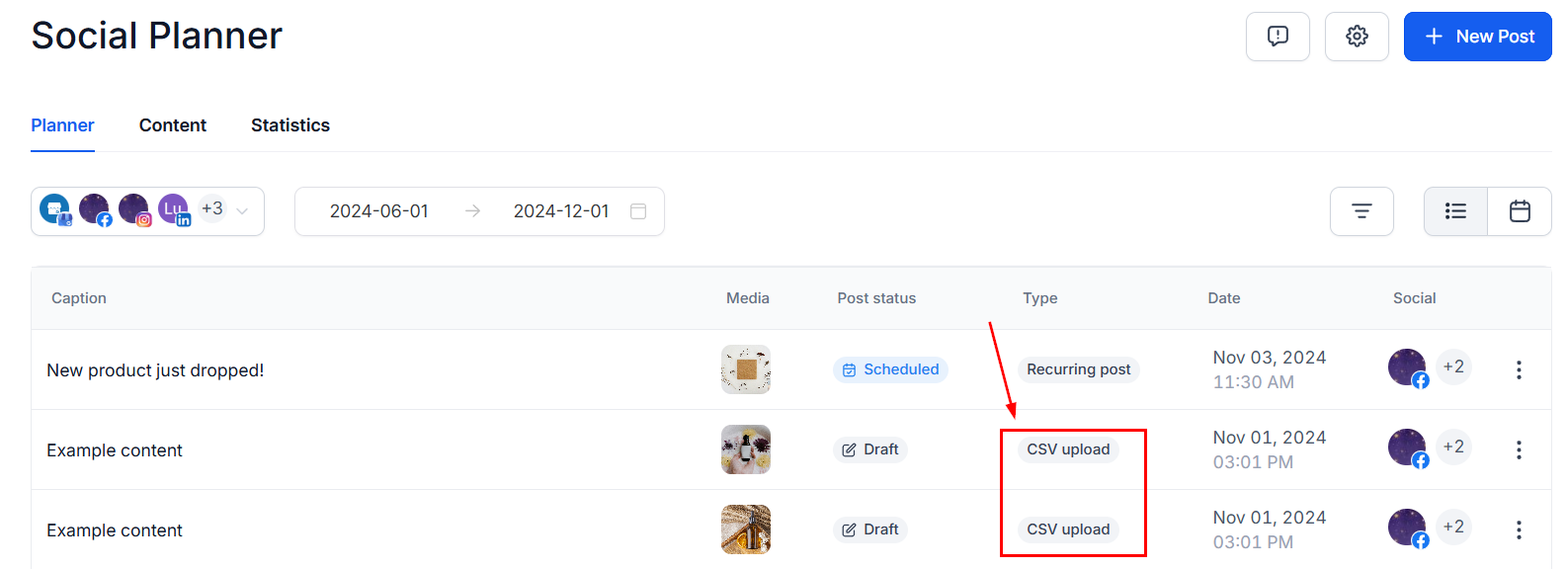 Head to the Content tab inside the Social Planner of the marketing section and select CSV to monitor the importing process. There will be two possible statuses for recently uploaded files: