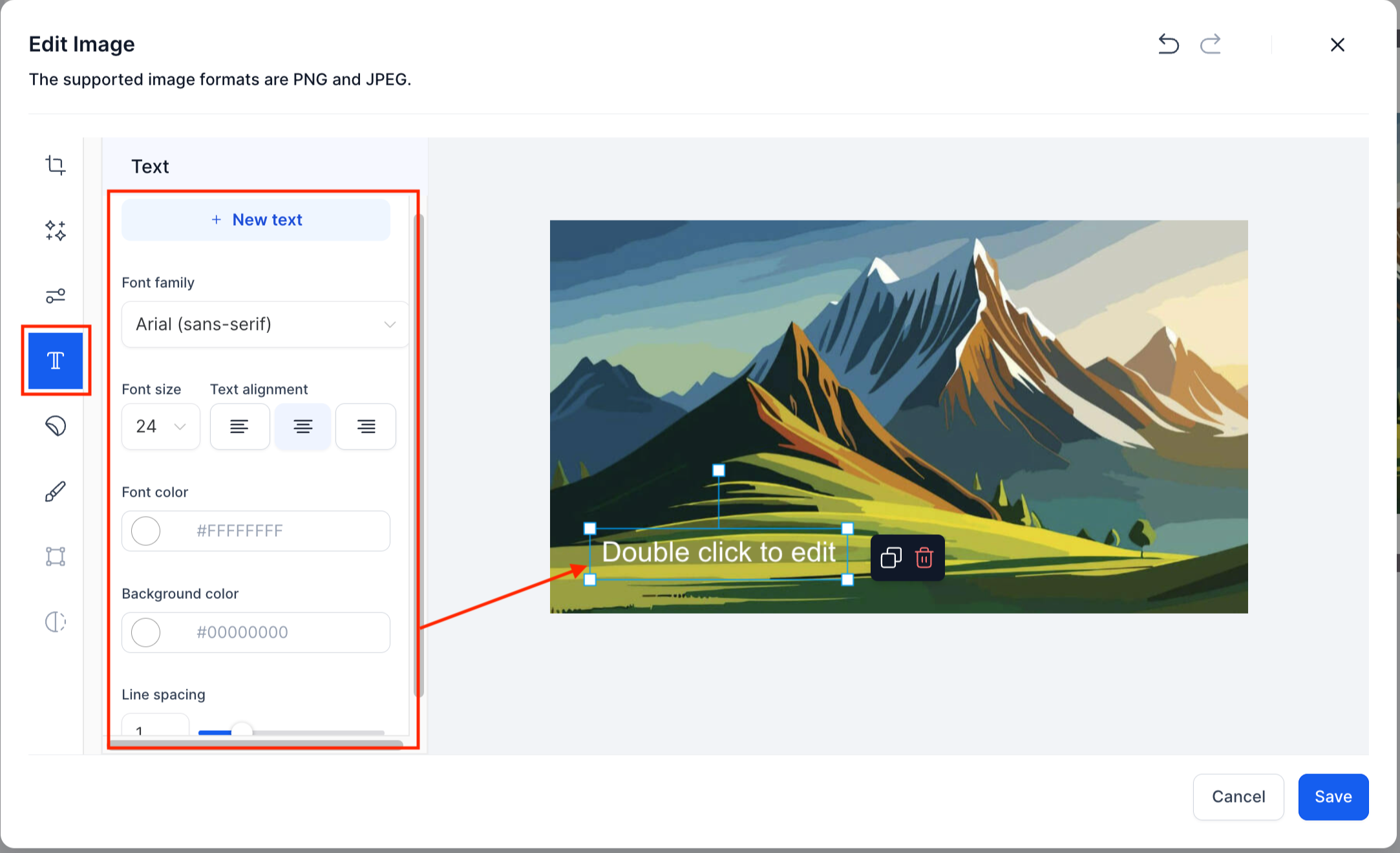 You can add text to your image in the text tab. Click on + New Text and a text box will appear. Double-click on your newly added text box to begin customizing. You can customize your text by choosing the font family, font size, alignment of the text, color, background color, and even the line spacing!